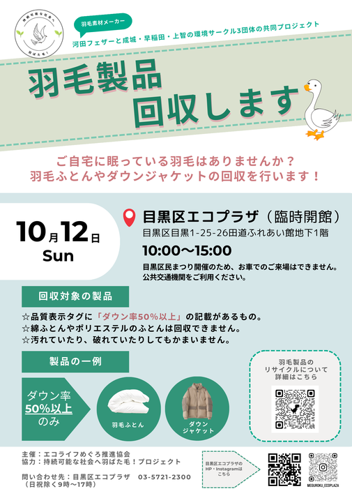 目黒区エコプラザでは、目黒区民まつりに合わせて臨時開館をおこないます。 その中で羽毛(ダウン)の回収を行います。下記をご覧の上、ご参加下さい。 ※お車でのお越しは出来ませんのでご了承ください。