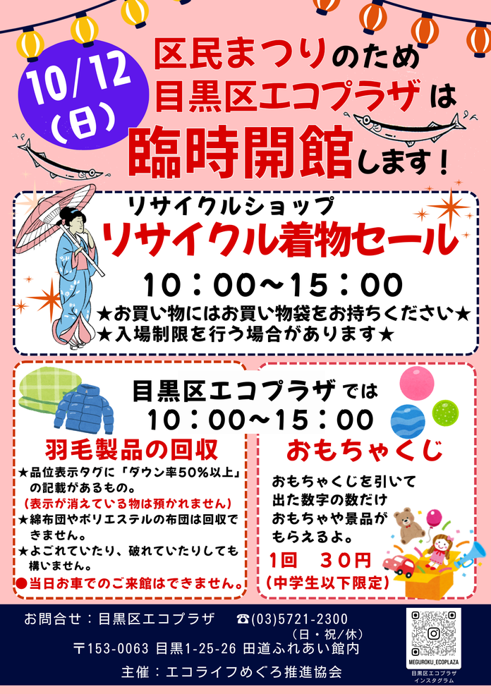 10月12日(日)開催の目黒区民まつりに合わせて、目黒区エコプラザは臨時開館いたします。(当日はお車でのご来館は出来ません) また、10時から15時まで「リサイクル着物セール」「おもちゃくじ(中学生以下対象)」「羽毛製品の回収」などのイベントを開催致します。 皆さまお誘いあわせの上、是非あそびにお越しください。